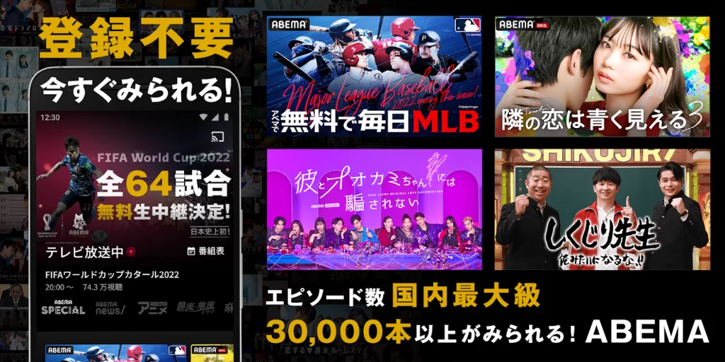 「ABEMA(旧AbemaTV)」は、会員登録不要・基本無料で楽しめるサービスです。